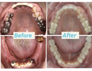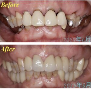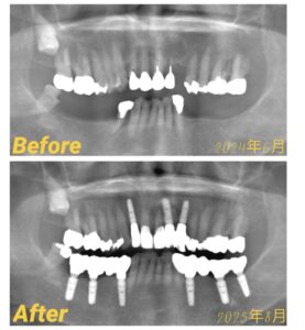 残せる歯はできるだけ保存し、欠損している部分にはインプラント治療を行いました。